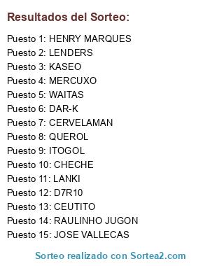 Lista de participantes: RAULINHO JUGON, KASEO, WAITAS, JOSE VALLECAS, CERVELAMAN, MERCUXO, LENDERS, HENRY MARQUES, CEUTITO, D7R10, CHECHE, QUEROL, LANKI, ITOGOL, DAR-K.