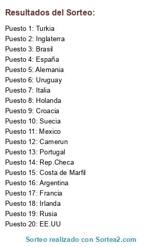 Lista de participantes: España, Brasil, Francia, Inglaterra, Argentina, Italia, Holanda, Portugal, Alemania, Camerun, Costa de Marfil, Uruguay, Mexico, EE.UU, Turkia, Suecia, Rep.Checa, Rusia, Croacia, Irlanda.