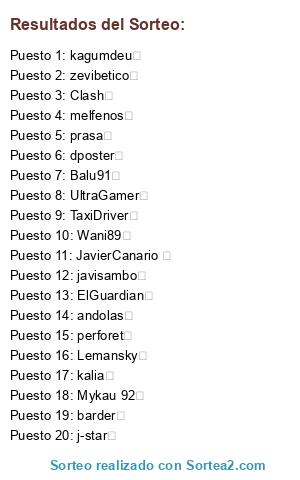 Lista de participantes: melfenos (5 participaciones), Balu91 (4 participaciones), Wani89 (3 participaciones), JavierCanario (2 participaciones), javisambo (2 participaciones), andolas (2 participaciones), Clash (2 participaciones), UltraGamer (2 participaciones), zevibetico (2 participaciones), kagumdeu (2 participaciones), dposter , perforet , prasa , kalia , barder , j-star , TaxiDriver , Mykau 92 , Lemansky , ElGuardian.