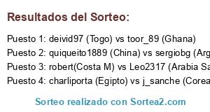 Lista de participantes: robert(Costa M) vs Leo2317 (Arabia Saudi), deivid97 (Togo) vs toor_89 (Ghana), charliporta (Egipto) vs j_sanche (Corea Sur), quiqueito1889 (China) vs sergiobg (Argelia).