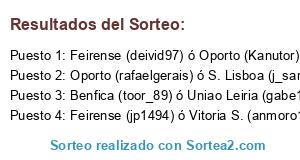 Lista de participantes: Feirense (jp1494) ó Vitoria S. (anmoro10), Feirense (deivid97) ó Oporto (Kanutor), Benfica (toor_89) ó Uniao Leiria (gabe12), Oporto (rafaelgerais) ó S. Lisboa (j_sanche).