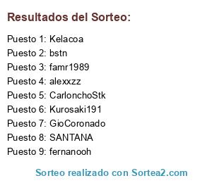 Lista de participantes: alexxzz, bstn, CarlonchoStk, famr1989, fernanooh, GioCoronado, Kelacoa, Kurosaki191, SANTANA.