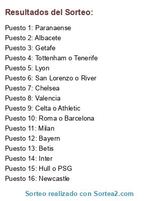 Lista de participantes: Getafe, Betis, Milan, Paranaense, Albacete, Valencia, Chelsea, Newcastle, Bayern, Inter, Tottenham o Tenerife, Hull o PSG, San Lorenzo o River, Celta o Athletic, Lyon, Roma o Barcelona.