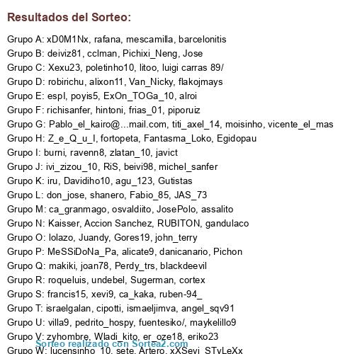 Lista de participantes: zlatan_10, litoo, JosePolo, lolazo, cortex, john_terry, IKER-00, Perdy_trs, maykelillo9, alixon11, xXSevi_STyLeXx, ivi_zizou_10, Wladi_kito, piporuiz, rafana, luigi carras 89/, RiS, xD0M1Nx, MeSSiDoNa_Pa, Z_e_Q_u_I, cipotti, burni, richisanfer, patolh, javict, francis15, er_oze18, Sugerman, angel_sqv91, alroi, Kaisser, roqueluis, luis_22, ravenn8, fortopeta, deiviz81, espI, zyhombre, alicate9, ca_kaka, osvaldiito, beivi98, poyis5, hintoni, israelgalan, ismaeljimva, assalito, pedrito_hospy, sete, poletinho10, moisinho, flakojmays, fuentesiko/, undebel, joan78, Juandy, gandulaco, danicanario, Egidopau, RUBITON, cclman, @Pablo_el_kairo, robirichu, shanero, frias_01, barcelonitis, eriko23, makiki, agu_123, Davidiho10, Gores19, ExOn_TOGa_10, JAS_73, Gutistas, iru, Jose, michel_sanfer, harrytxu, mescamilla, ruben-94_, Xexu23, Pichixi_Neng, vicente_el_mas, titi_axel_14, Accion Sanchez, lucensinho_10, Fabio_85, Van_Nicky, don_jose, Artero, ca_granmago, blackdeevil, Fantasma_Loko, Pichon, xevi9, villa9.
