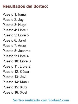 Lista de participantes: Javi, Anxo, Manu, Jay, Hugo, Xoel, Jarol, César, Isma, Juanma, Xubi, Libre 1, Libre 2, Libre 3, Libre 4, Libre 5.