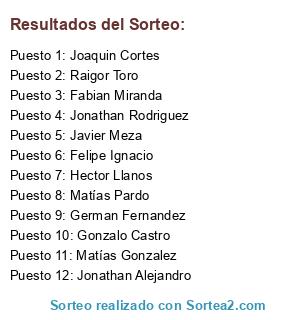 Lista de participantes: Matías Pardo, Hector Llanos, German Fernandez, Fabian Miranda, Joaquin Cortes, Felipe Ignacio, Matías Gonzalez, Gonzalo Castro, Raigor Toro, Jonathan Alejandro, Jonathan Rodriguez, Javier Meza.