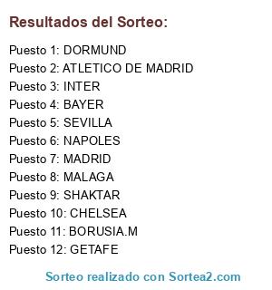 Lista de participantes: NAPOLES, CHELSEA, MADRID, DORMUND, ATLETICO DE MADRID, GETAFE, SEVILLA, INTER, BAYER, MALAGA, SHAKTAR, BORUSIA.M.