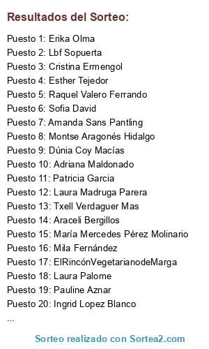 Lista de participantes: Paloma Faba, ElRincónVegetarianodeMarga , Paqui Pelegrina Ruiz, Raquel Valero Ferrando, Ramon Bertolín, Anthon Tenorio , Mar Boy Glez , Manolita Fresa, Patricia BA, Nuria Mc , Cristina Ermengol, Blanca Luna , Eugenia Tejerina , Rita Solà , Sacri Fuentes, Eva Sibils , Laura Palome , Mayte Zuñiga Gimenez , Sara Perez , Sofia David , Elena Rodríguez Ortiz, Nina Pics, Carmen Muñoz , Marta Meléndez Ylla , Joana López Teruel , Ana Serra Devesa, Angels Gavaldà Bonachela, Izaro Susperregi , Gala Marbu , Esther Tejedor , Marisa Hernando Zafra , Ainara Berridi, Fátima Rodríguez, Myriam Gonzalez Martin, David Ramirez Grande , Lydia Verdaguer Lluis, Carles Conejo, Eli Zabeth , Al Sito, Carolina Clemente , Flores en tu Ensalada ::KITSGourmet::, Carla Dica , Verónica Bolívar Domínguez , Montse Aragonés Hidalgo , Leire Piriz, Mayra Pedraza de Lara, Ailcia Nevot , Francina Bc, Verónica Vero , Salma Said , Vanessa Martinez, Nazaret Cabezudo Vergara , Maria Slow, Sandra Om , Susana Suñer Mariano , Carolina GR , Paula Martín , Gabby Diaz , Mari-Pop Mari-Pop , Raquel Coma Roura , Briz Lopez , Adriana Lozano , Vane Rozas , Natalia Ratzel , Margalida Reinés, Maria Pilar Barretina GInesta , Fabiola Riveroll , Begoña Nada Nada , Belén Atencia Conde-Pumpido , Maribell Moon , Dúnia Coy Macías , Jorge Tormo , Sara Melia Marti, Sara Jonàs Llauradó, Rosa Miralles , Araceli Bergillos , Ignasi Pastil Cebo , María José González Sánchez , Charo Jiménez López , Sònia Viéguez, Almudena Oyola Velasco, Joana Bananna, Encarni Izquierdo , Ana Casas Filiol de Raimond , Rangoli Manlleu, Laura Algué Moreno , Eliani Torres , Laura Renata Monges, Sialbeya Deseo , Marguerite Gaultier, Erika Olma , Amanda Sans Pantling, Victoria Gervasi , Minia Glez , Miriam Martinez , Mila Fernández , Patricia Garcia, Mireia Sotorra Querol , Mandarina Langstrumpf , Silvia Garcia , Alexa Ginesta Madruga , Agnès Grané , Gastro Cenicienta , Martina Ferrer Rosell , Eva Corbera, Míriam Tan Pichi , Montse Reus , Creativariam Jerez , María Mercedes Pérez Molinario, Montse Morató, Ari Ari O O , Emma Ruiz Enriquez , Txell Verdaguer Mas , Elvira Martinez, Annabel Puy, Laura Mart Sit, Patri Patry Patri, Marta Sala Font, Sonia Ruiz , Mar Ta Ka, Raquel Giménez, Ana Odügra Sesac , Alicia Mangues , Cris Mauri, Anna Coma Roura , Laura Madruga Parera , Andrea Perez , Adriana Maldonado , Almudena Rodriguez Casero , Mari Carmen Azkona , Claudia Diana Voluptas , Sílvia Giró Gràcia, Helena Monllor , Lucia Gomez, Keles SCh , María Isabel Tejedor Díez , Sònia Feliu Soler, Gemma Carreras , Ingrid Lopez Blanco, Judit Espachs, Susi Traver , Pauline Aznar, Cris Pipopipeypapas , Elena Canet, Laura Oballe, Lbf Sopuerta , .