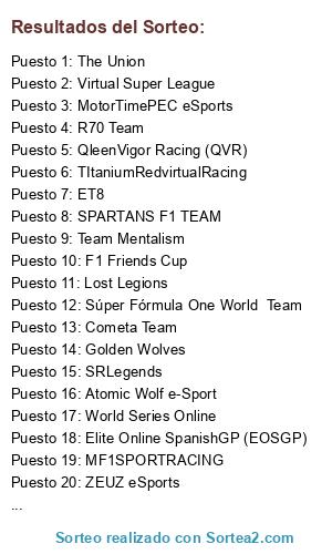 Lista de participantes: Cometa Team, MotorTimePEC eSports, ET8, Lost Legions, Atomic Wolf e-Sport, QleenVigor Racing (QVR), Team Mentalism, SPARTANS F1 TEAM, F1 Friends Cup, Fórmula Virtual Racing, Royals eSports, Golden Wolves, World Series Online, Elite Online SpanishGP (EOSGP), The Union, SRLegends, TItaniumRedvirtualRacing, MF1SPORTRACING, JKL Esports, ZEUZ eSports, R70 Team, Spain Gran Formula, Súper Fórmula One World Team, Virtual Super League.