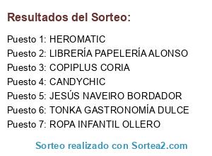 Lista de participantes: CANDYCHIC, COPIPLUS CORIA, HEROMATIC, JESÚS NAVEIRO BORDADOR, LIBRERÍA PAPELERÍA ALONSO, ROPA INFANTIL OLLERO, TONKA GASTRONOMÍA DULCE.