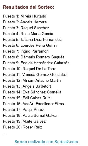 Lista de participantes: Maria Rueda Ortiz, Lourdes Peña Gorrin, Na Nit, Isabel Torres, Angels Batlletort, Maite Galvez, Carles Ripoll Sanchez, Eva Fitó Toribio, Eva Sánchez Cornellà, Paqui Perez, Raquel Sanchez, Raquel De La Torre, AdaArt ExcellenceFilms, Silvia Ruiz, Karen Mardones, Rosa Maria Garcia, Yolanda Haro Ferron, Angels Herrera, Laura Margall Buxeda, Vane Ssa, Ana Quer, Roser Ruiz, Sonia Fuentes Dominguez, Mireia Hurtado, Gemma Bosch, Cristina Pérez Ferrón, Alba Sánchez, Dámaris Romero Baqués, Familia Souza Lossada, Miriam Artacho Martin, Vicen Cas, Sigrid Mallol, Tatiana Diaz Fernandez, Aida Vila, Janine Geiss, Pili Polo, Ari Figueras L, Ingrid Parramon, Eneida Hernández Cabasés, Vanesa Gomez Gonzalez, Paula Bernal Galvan, Dama García, Karen Diaz Fernandez, Isabel Serret Abril, Sílvia Armangué, Feli Cabas Ruiz, Monica Castillo Izquierdo.