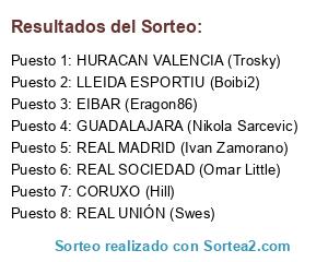 Lista de participantes: LLEIDA ESPORTIU (Boibi2), EIBAR (Eragon86), HURACAN VALENCIA (Trosky), REAL UNIÓN (Swes), REAL SOCIEDAD (Omar Little), REAL MADRID (Ivan Zamorano), GUADALAJARA (Nikola Sarcevic), CORUXO (Hill).