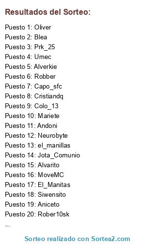 Lista de participantes: Robber, Siwensito, Oliver, Jota_Comunio, El_Manitas, Neurobyte, Blea, Mariete, Prk_25, Cristiandq, Rober10sk, Alverkie, Andoni, Pacojuaki77, Umec, Aniceto, el_manillas, Colo_13, Capo_sfc, MoveMC, Alvarito.