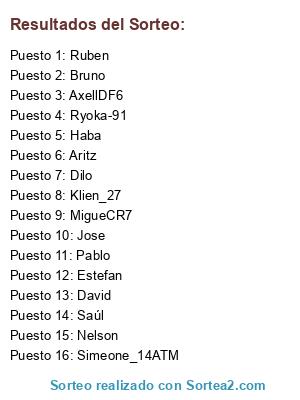 Lista de participantes: MigueCR7, Bruno, Simeone_14ATM, Pablo, AxellDF6, David, Klien_27, Ryoka-91, Jose, Saúl, Dilo, Ruben, Haba, Nelson, Aritz, Estefan.