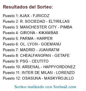Lista de participantes: ARSENAL - HAPPYORDONEZ, OSASUNA - MASKYROJILLO, CHEALFANGPAN - GETAFE, MANCHESTER CITY - PIMBA, OL. LYON - GOEMANU, PSG - CEUTITO, GIRONA - KIKAMBAS, R. SOCIEDAD - ELTIRILLAS, INTER DE MILAN - LORENZO, PARMA - HARPER, MADRID - JUANRATM, AJAX - FJRICOZ.