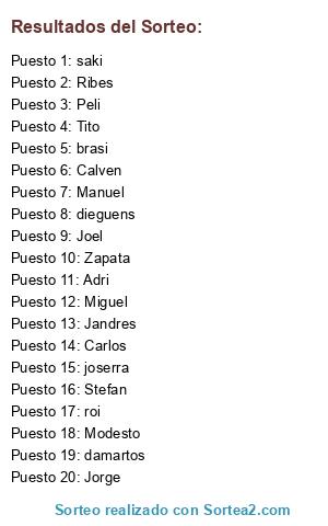 Lista de participantes: Calven, Adri, Jorge, brasi, damartos, joserra, Carlos, Ribes, Tito, saki, Stefan, Zapata, Manuel, Miguel, dieguens, roi, Joel, Modesto, Peli, Jandres.