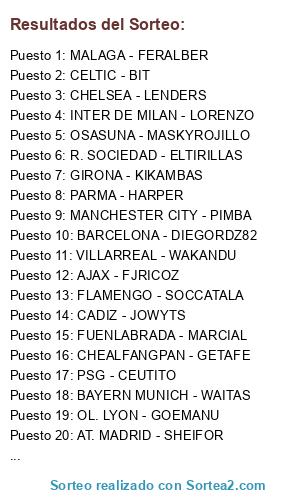 Lista de participantes: VALENCIA - FLORENKIKO, JUVENTUS - SATRUSTEGUI, CHELSEA - LENDERS, AT. MADRID - SHEIFOR, BAYERN MUNICH - WAITAS, MALAGA - FERALBER, CADIZ - JOWYTS, VILLARREAL - WAKANDU, BARCELONA - DIEGORDZ82, FUENLABRADA - MARCIAL, FLAMENGO - SOCCATALA, CELTIC - BIT, ARSENAL - HAPPYORDONEZ, OSASUNA - MASKYROJILLO, CHEALFANGPAN - GETAFE, MANCHESTER CITY - PIMBA, OL. LYON - GOEMANU, PSG - CEUTITO, GIRONA - KIKAMBAS, R. SOCIEDAD - ELTIRILLAS, INTER DE MILAN - LORENZO, PARMA - HARPER, MADRID - JUANRATM, AJAX - FJRICOZ.