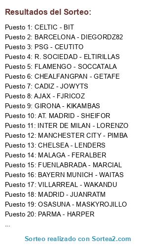 Lista de participantes: VALENCIA - FLORENKIKO, JUVENTUS - SATRUSTEGUI, CHELSEA - LENDERS, AT. MADRID - SHEIFOR, BAYERN MUNICH - WAITAS, MALAGA - FERALBER, CADIZ - JOWYTS, VILLARREAL - WAKANDU, BARCELONA - DIEGORDZ82, FUENLABRADA - MARCIAL, FLAMENGO - SOCCATALA, CELTIC - BIT, ARSENAL - HAPPYORDONEZ, OSASUNA - MASKYROJILLO, CHEALFANGPAN - GETAFE, MANCHESTER CITY - PIMBA, OL. LYON - GOEMANU, PSG - CEUTITO, GIRONA - KIKAMBAS, R. SOCIEDAD - ELTIRILLAS, INTER DE MILAN - LORENZO, PARMA - HARPER, MADRID - JUANRATM, AJAX - FJRICOZ.