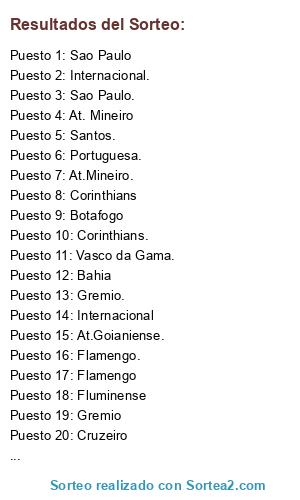 Lista de participantes: Internacional, Flamengo, Cruzeiro., Flamengo., Santos, Palmeiras, At.Goianiense, Portuguesa, Gremio, Botafogo, At.Goianiense., Sao Paulo, Palmeiras., Fluminense, Vasco da Gama, Cruzeiro, At. Mineiro, Bahia, Botafogo., At.Mineiro., Coritiba, Vasco da Gama., Corinthians, Gremio., Bahia., Coritiba., Sao Paulo., Santos., Corinthians., Internacional., Fluminense., Portuguesa..