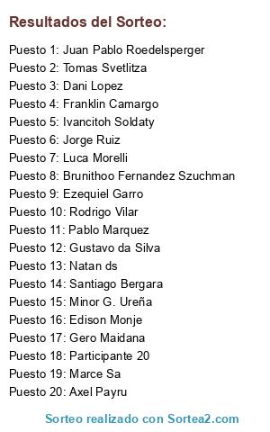 Lista de participantes: Axel Payru, Minor G. Ureña, Tomas Svetlitza, Jorge Ruiz, Marce Sa, Juan Pablo Roedelsperger, Natan ds, Pablo Marquez, Dani Lopez, Luca Morelli, Edison Monje, Gero Maidana, Ivancitoh Soldaty, Ezequiel Garro, Franklin Camargo, Rodrigo Vilar, Santiago Bergara, Gustavo da Silva, Brunithoo Fernandez Szuchman, Participante 20.