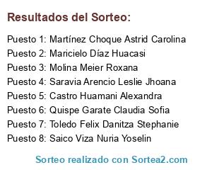 Lista de participantes: Quispe Garate Claudia Sofia, Castro Huamani Alexandra, Toledo Felix Danitza Stephanie, Saico Viza Nuria Yoselin, Saravia Arencio Leslie Jhoana, Martínez Choque Astrid Carolina, Molina Meier Roxana, Maricielo Díaz Huacasi.