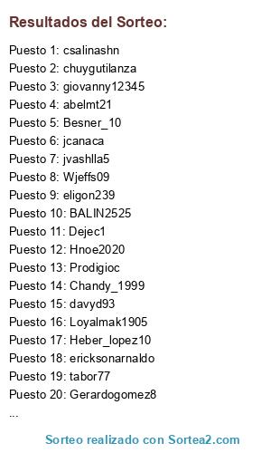 Lista de participantes: abelmt21 , Angelito_431985, Avila22_elvir621, BALIN2525, Besner_10, Blizz2124, brcv315, Cesrodriguez91, Chandy_1999, chuygutilanza , coloalexander11, csalinashn, CuloDeSapo, davyd93, Dejec1, edrey9090, Electivemadrid7, eligon239, elmiso7, ericksonarnaldo, GarraCatracha91, Gerardogomez8, giovanny12345, Heber_lopez10, Hectorfernando25, Hnoe2020, ivisjose, jcanaca, JesseTrejo10, Josue_HN2012, jvashlla5, Loyalmak1905, manueles199, Miguelbass1 , Ponty2012, Prodigioc, saint_muma24, Soto04-27-1993, tabor77, Wjeffs09.