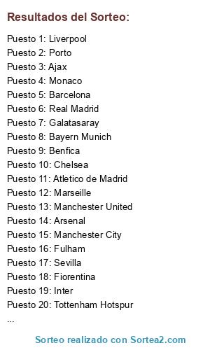 Lista de participantes: Barcelona, Real Madrid, Atletico de Madrid, Valencia, Sevilla, Manchester United, Manchester City, Chelsea, Arsenal, Tottenham Hotspur, Fulham, Liverpool, Juventus, Milan, Inter, Roma, Napoli, Lazio, Fiorentina, PSG, Marseille, Lyonnais, Monaco, Lille, Bayern Munich, Borussia Dortmund, Schalke 04, Galatasaray, Fenerbahce, Porto, Benfica, Ajax.
