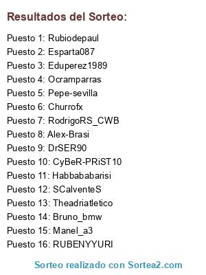 Lista de participantes: Esparta087, Eduperez1989, Pepe-sevilla, Churrofx, Alex-Brasi, Bruno_bmw, Rubiodepaul, RodrigoRS_CWB, Ocramparras, SCalventeS, Habbababarisi, Theadriatletico, CyBeR-PRiST10, DrSER90, Manel_a3, RUBENYYURI.