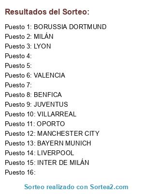 Lista de participantes: INTER DE MILÁN, OPORTO, BORUSSIA DORTMUND, MILÁN, MANCHESTER CITY, LIVERPOOL, JUVENTUS, BENFICA, BAYERN MUNICH, VILLARREAL, LYON, VALENCIA, , , , .