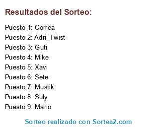 Lista de participantes: Mike, Xavi, Correa, Mario, Sete, Guti, Mustik, Adri_Twist, Suly.