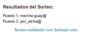 Lista de participantes: anavictoria@, eurotenvalsl@, natalyaatamas@, manuelportoles@, reme@, rafa.checa@, ripollvalienteveronica@, cristina1_lo@, rafanosan@, marga.46600@, noe_alegre1986@, engara13@, raficece@, irene23blazquez@, regalosmsc@, carmenespartero68@, fontenla65@, a.nikolic@, silviamp99@, raisa1fc@, evamariapareja@, humberto46100@, hele13@, merche.guay@, javi_elche@, cristina-gomis@, jerpito@, julioalbertoramos@, luzmartinezllorens@, guijarro76@, conchirb@, sandra_mengual@, rocarju@, jonatanestebant@, iruiz639@, nataliaruizmi@, maca4744@, encarnaesteban@, superjose80@, lolafuentes43@, annadakota@, delfingm73@.