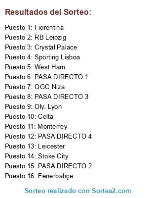 Lista de participantes: Oly. Lyon, RB Leipzig, Stoke City, Leicester, Celta, West Ham, Crystal Palace, Fiorentina, Sporting Lisboa, Monterrey, OGC Niza, Fenerbahçe, Pasa directo 1, Pasa directo 2.
