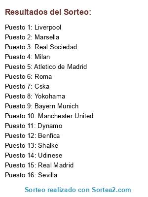 Lista de participantes: Dynamo, Sevilla, Atletico de Madrid, Liverpool, Udinese, Bayern Munich, Real Sociedad, Milan, Roma, Yokohama, Real Madrid, Shalke, Benfica, Manchester United, Cska, Marsella.