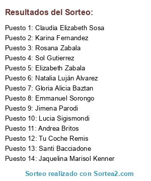 Lista de participantes: Tu Coche Remis, Andrea Britos, Emmanuel Sorongo, Santi Bacciadone, Sol Gutierrez, Elizabeth Zabala, Jimena Parodi, Gloria Alicia Baztan, Lucia Sigismondi, Natalia Luján Alvarez, Karina Fernandez, Jaquelina Marisol Kenner, Claudia Elizabeth Sosa, Rosana Zabala.