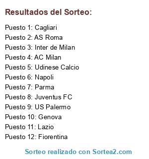 Lista de participantes: AS Roma, Inter de Milan, US Palermo, Juventus FC, Udinese Calcio, Napoli, AC Milan, Parma, Fiorentina, Lazio, Cagliari, Genova.