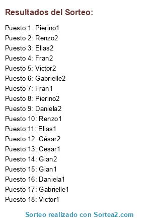 Lista de participantes: Gabrielle1, Gabrielle2, Fran1, Fran2, Daniela1, Daniela2, Renzo1, Renzo2, Pierino1, Pierino2, Cesar1, César2, Gian1, Gian2, Victor1, Victor2, Elias1, Elias2.