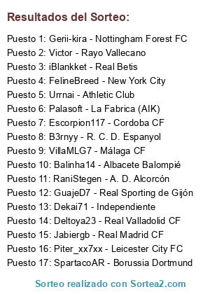 Lista de participantes: B3rnyy - R. C. D. Espanyol, Dekai71 - Independiente, Gerii-kira - Nottingham Forest FC, RaniStegen - A. D. Alcorcón, Palasoft - La Fabrica (AIK), SpartacoAR - Borussia Dortmund, GuajeD7 - Real Sporting de Gijón, Balinha14 - Albacete Balompié, Jabiergb - Real Madrid CF, Victor - Rayo Vallecano, iBlankket - Real Betis, VillaMLG7 - Málaga CF, Urrnai - Athletic Club, Deltoya23 - Real Valladolid CF, Piter_xx7xx - Leicester City FC, FelineBreed - New York City, Escorpion117 - Cordoba CF.