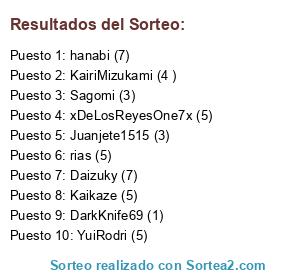 Lista de participantes: TakaShino (3), Daizuky (7), AjmsVnzla (4), Juanjete1515 (3), pepeross (7), hanabi (7), UchihaShin (5), GenmaYagyuu (5), Duple (3), Sagomi (3), JEBERNABHIL (4), LDBM (4), KairiMizukami (4 ), JabiUchiha (4), AlanJGM (7), YuiRodri (5), Kaikaze (5), BorutoUchiha (3), xDeLosReyesOne7x (5), rias (5), Shintaru034 (5), Radamanthis (5), Magu (4), DarkKnife69 (1), BigJorge (5).
