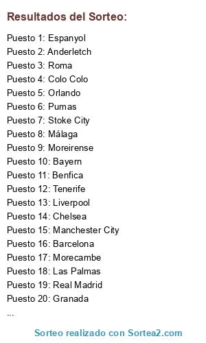 Lista de participantes: Barcelona, Tenerife, Al Hilal, Real Madrid, Stoke City, Roma, Granada, Orlando, Espanyol, Colo Colo, Morecambe, Pumas, Bayern, Chelsea, Deportivo, Manchester City, Las Palmas, Liverpool, Moreirense, Málaga, New York Red Bulls, Benfica, Leeds, Anderletch.