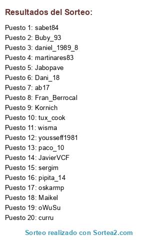 Lista de participantes: daniel_1989_8, Kornich, sergim, tux_cook, oskarmp, ab17, oWuSu, JavierVCF, sabet84, martinares83, paco_10, Buby_93, Fran_Berrocal, pipita_14, curru, wisma, Dani_18, Jabopave, Maikel, yousseff1981.