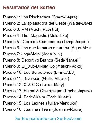 Lista de participantes: The_Magestic (Molo-Exe), Futbol & Champagne (Pocho-Jigsaw), Deportivo Branca (Seth-Nahuel), Dupla de Campeones (Temp-Jorge1), Juanmas Team (Juanma-Rodra), La aplanadora del Oeste (Walter-David), Los Pinchacaca (Chero-Lepra), Fede&Kaka (Fede-kluate), Diversion (Guille-Alberto), Los Leones (Julian-Menduko), RM (Machi-Rcentral), El_Duo-DiNaMiCo (Maschi-Koko), C.A.C.G (Lucas-Maty), Los que te miran de arriba (Agus-Meta), Joga&Mini (Joga-Mini), Los Borbotones (Emi-CABJ).