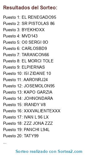 Lista de participantes: I5I ZIDANE 10, JJGALLOSO, EL RENEGADO95, XXXVALIENTEXXX, SR PISTOLAS 86, IRANDY V8, JESUPANTUFLA35, O0 SERGI 0O, AARONRJ24, IVAN L 96 LX, CARLOSBD9, L IMAAGIIK L, KUALITY100, SPIFFIESTJOSE, ALEXFCBARCELONA, TORRES1992, TARANCON66, ELPIERNAS, BYEKHOXX, PANCHI L94L, RAULENDJ8, JOHNONDARA, ZZZ JONA ZZZ, KAPO GARZIA, TATY99, CHRISLOPI, PHUNISITO, EL MORCI TOLE, JUANFRAN333, JOSEMOLON95, ESENCIAL ALPINO, MVD143.