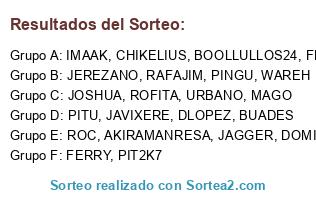 Lista de participantes: DOMI, JAVIXERE, AKIRAMANRESA, WAREH, PINGU, JEREZANO, PIT2K7, MAGO, DLOPEZ, JOSHUA, ROC, RAFAJIM, PITU, BUADES, BOOLLULLOS24, FRODEO, CHIKELIUS, JAGGER, FERRY, ROFITA, IMAAK, URBANO.