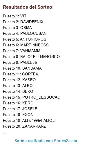 Lista de participantes: BEKO, PABLOCUSAN, VITI, ANTONIOROS, GARCIALEGA, VANMAMM, EXON, OSMA, KERO, MARPE, BANDAMA, ALBO, MAKAROOV, ZANARKANZ, POTRO_DESBOCAO, DAVIDFENIX, KASEO, CORTEX, ALI-549954-ALIOLI, MARTINNBOSS, PABLE55, BALOTELLI45NORCO, SULLY, JOSELE.