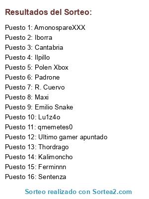 Lista de participantes: Ferminnn, qmemetes0, Maxi, Cantabria, Padrone, Lu1z4o, R. Cuervo, AmonospareXXX, Sentenza, Thordrago, Iborra, Kalimoncho, Ilpillo, Emilio Snake, Polen Xbox, Ultimo gamer apuntado.