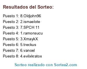Lista de participantes: 1.ramonsucu, 2.ismaelote, 3.XmaykX, 4.evilxkratox, 5.treckus, 6.vanoel, 7.SPCH 11, 8.Oldjohn96.