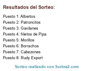 Lista de participantes: Morillos, Albertos, Patroncitos, Rudy Export, Gavilanes, Nietos de Pipa, Borrachos, Cabezones.