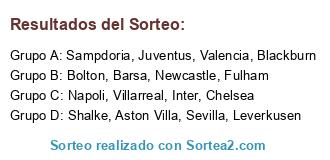 Lista de participantes: Aston Villa, Valencia, Shalke, Blackburn, Sampdoria, Fulham, Inter, Juventus, Chelsea, Barsa, Newcastle, Villarreal, Napoli, Leverkusen, Sevilla, Bolton.