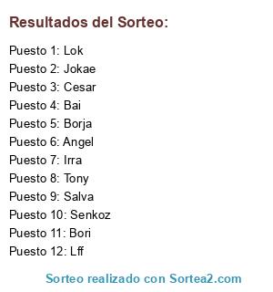 Lista de participantes: Cesar, Salva, Borja, Tony, Lff, Bori, Lok, Angel, Jokae, Bai, Irra, Senkoz.