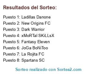 Lista de participantes: New Origins FC, Fantasy Eleven, JoGa BoNiToo, La Rojita FC, Spartans SC, xMoRTal SKiLLsX, Dark Warrior, Ladillas Danone.
